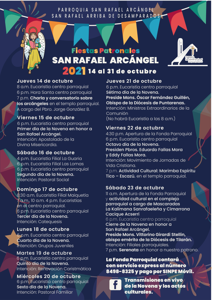 Con mucho agrado, junto al Consejo Pastoral y al Consejo Económico, les presento las actividades de celebración de nuestra Fiesta Patronal 2021. Actividades que podremos vivir dentro y fuera de nuestro distrito, de forma presencial y virtual. Reflexionemos en estos días entorno a la figura del arcángel y pidamos recibir la medicina de Dios. Además oremos, para que nosotros también nos convirtamos en medicina de bien para los demás.