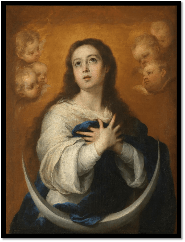 Apareció una señal portentosa en el cielo: Una mujer vestida del sol, la luna por pedestal y coronada con doce estrellas. Estaba en cinta y gritaba porque iba a dar a luz.